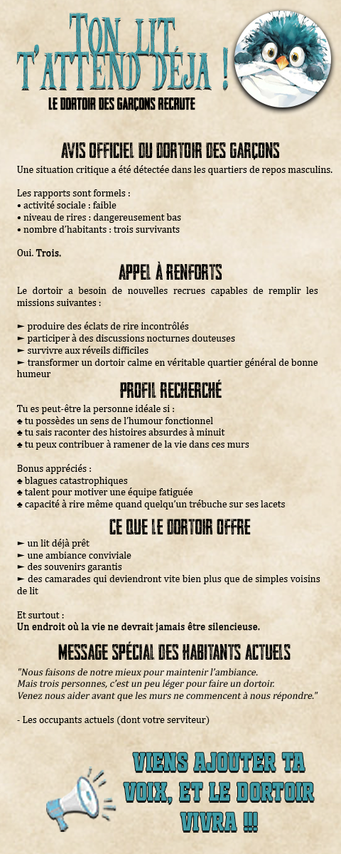 Et l’évènement se répéta dans le dortoir des garçons, puis dans le dortoir mixte. Dans ce dernier on pouvait entendre les membres appeler quelqu’un qui pouvait bien passer par là. Les autres dortoirs l’entendirent, et c’est à ce moment-là que tout le monde se rendit compte qu’ils étaient tous enfermés dans leur chambre.